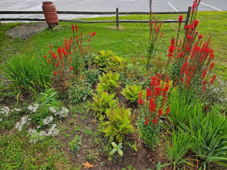 Cardinal flowers and other native plants doing their job to soak up the rain at the Greenland Central School (photo credit: Sally Soule)