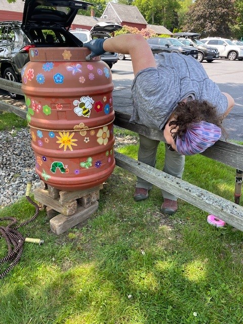 Spring maintenance activities included raking accumulated debris from the garden, trimming old plant growth, inspecting plants to determine viability, and setting up a cistern to provide water for summer irrigation in the event of dry weather. Much of the important maintenance work was organized and led by Greenland resident Jean Eno, raingarden volunteer extraordinaire.
