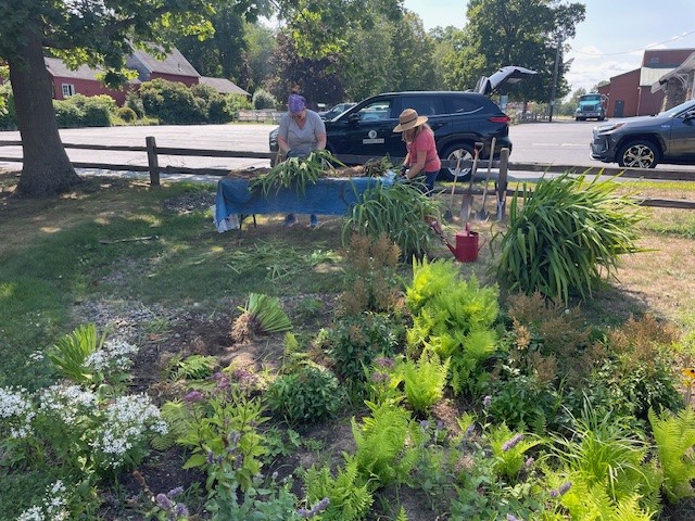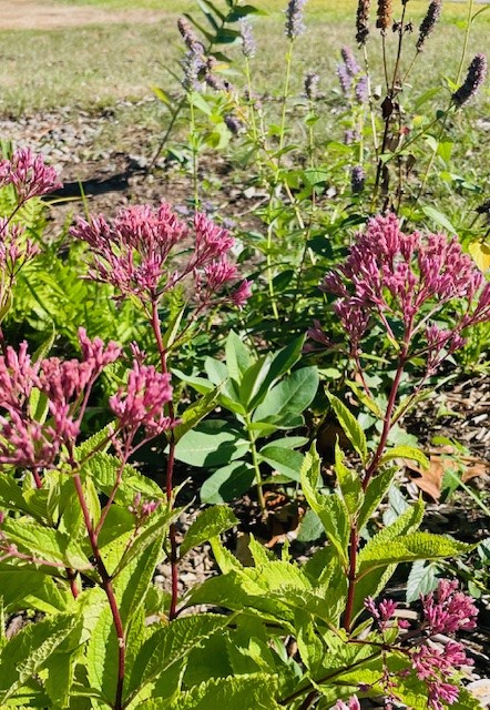 Volunteers returned to the garden during the summer to add more plants to fill gaps in the planted area and increase plant diversity. Pollinator-friendly native plants including hyssop, Joe Pye Weed, and rudbeckia were incorporated into the garden. Many pollinators were seen enjoying these new additions! In July, Jean invited members of the Greenland Conservation Commission for a garden tour to learn about the raingarden’s purpose and the unique partnership that led to its installation.